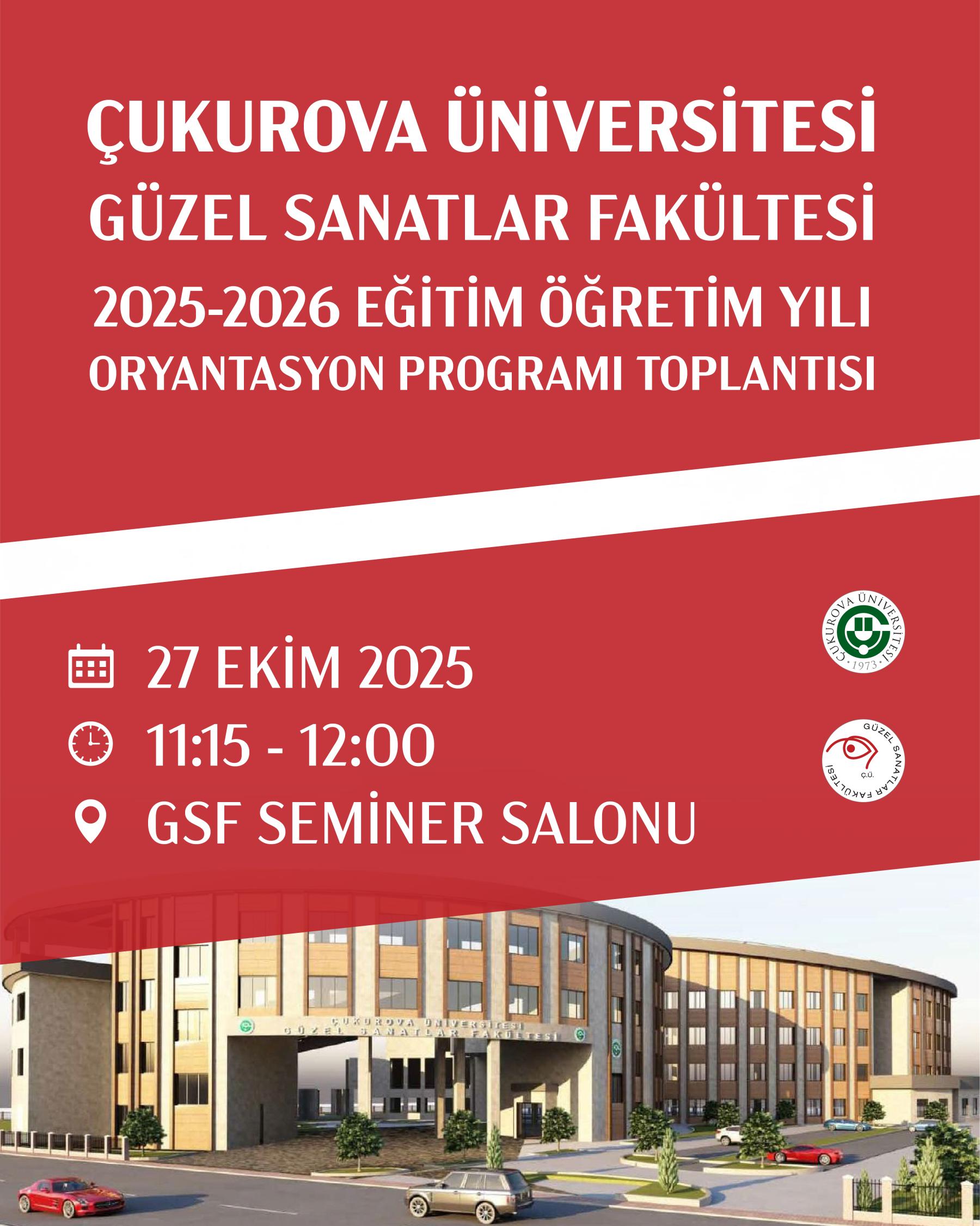 Fakültemize yeni kayıt yaptıran birinci sınıf öğrencilerimiz için 2025-2026 Eğitim-Öğretim Yılı Oryantasyon Programı toplantısı, 27 Ekim 2025 Pazartesi günü saat 11.15 – 12.00 arasında Güzel Sanatlar Fakültesi Seminer Salonu’nda gerçekleştirilecektir.