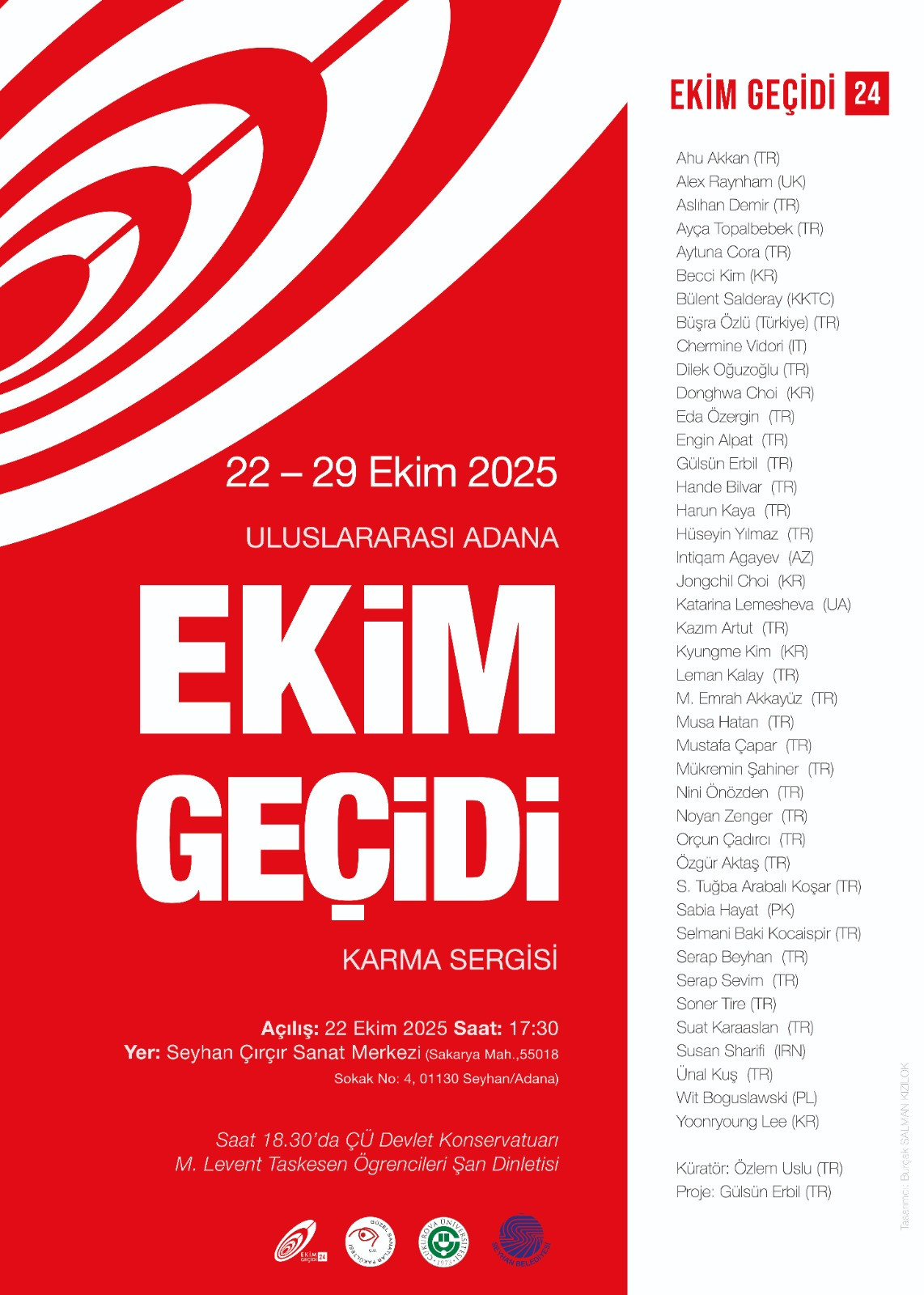 Adana Uluslararası Ekim Geçidi Sergisi, 22 Ekim 2025 tarihinde Seyhan Belediyesi Çırçır Sanat Merkezi’nde açıldı. Cumhuriyetin 102. yılı ve Mustafa Kemal Atatürk’e ithafen düzenlenen etkinlik, seçkin sanatçıların katılımıyla uluslararası ölçekte genişleyen bir sanat platformu olarak gerçekleşti.